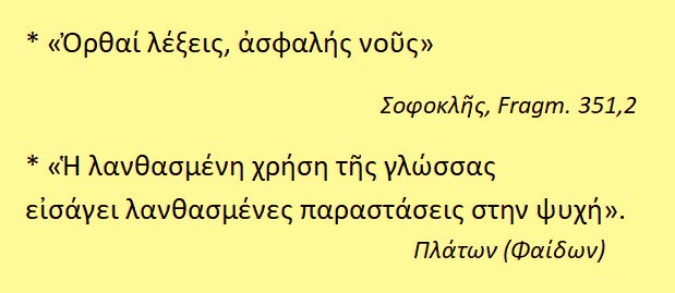 Ο προφορικός λόγος εν αντιθέσει προς τον γραπτό , δεν έχει ούτε γραφή ούτε ορθογραφία. Η ορθογραφία δε , έχει αξία ΜΟΝΟ εάν την συσχετίσουμε με την ετυμολογία . Η ετυμολογία είναι ο δρόμος της αληθείας { έτυμον }. Στην σημερινή όμως παρακμιακή εποχή , με την μονοτονία – μονοφωνία του μονοτονικού συστήματος γραφής , εύκολα χάθηκε και η ετυμολογία και η πολυφωνία. Στην ερώτηση π.χ. τι είναι το κάλλος , κατά πάσα πιθανότητα η απάντηση θα είναι : η ομορφιά , το καλό , η ωραιότητα .Αδυνατούμε ,δηλαδή ,οι σημερινοί Έλληνες να ετυμολογήσουμε . Αδυνατούμε έτσι να αποκαλύψουμε την αλήθεια των λέξεων και καταφεύγουμε σε ερμηνείες * , χρησιμοποιώντας άλλες λέξεις παρεμφερείς ή μη , καλύπτοντας την ουσία και την αλήθεια { το έτυμον } ,που εμπεριέχει η ζητούμενη λέξη . Τα λεξικά των λεγομένων συνωνύμων { όνυμα =όνομα } παρέχουν την δυνατότητα της αντικατάστασης μιας λέξης από μια άλλη ‘ συνώνυμη , που όμως ..δεν έχει το ίδιο όνομα ..!! Γιατί στην Ελληνική γλώσσα καμμία λέξη δεν είναι συνώνυμη με άλλη. {βλ.π.χ τον εκλεκτό καθηγητή κ.Μπαμπινιώτη .Έχει γράψει και Ετυμολογικό λεξικό και Λεξικό συνωνύμων ..! } .
