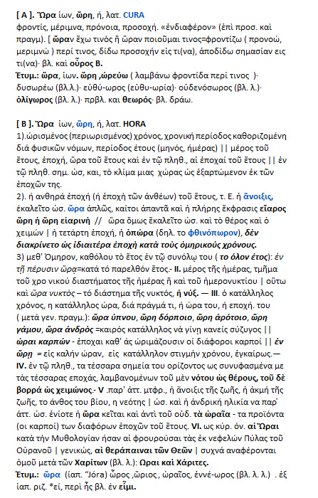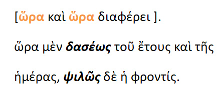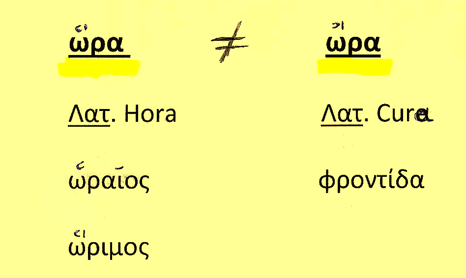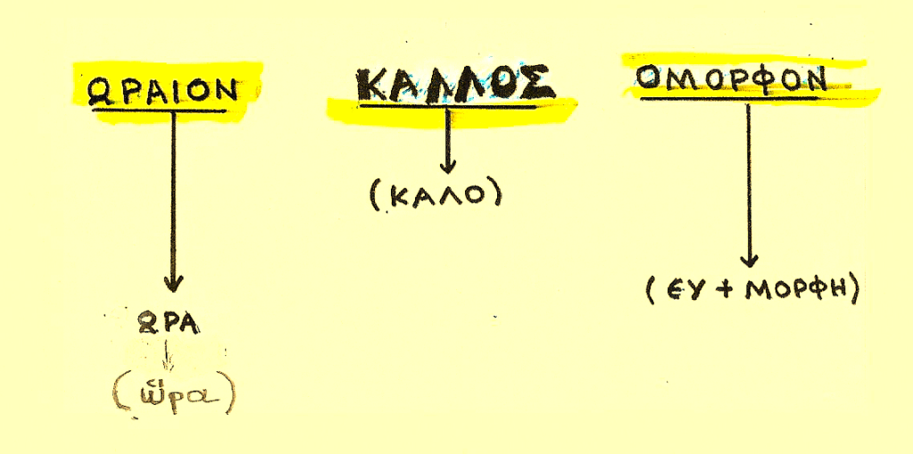 Άλλο το κάλλος { < καλό } , άλλο το όμορφο {= εύμορφος : ευ + μορφή [= πρόσωπο] εξ’ού και η μορφή του Χριστού , το πρόσωπο του Χριστού},άλλο το ωραίο {< ώρα [2]}ΏΡΑ με ψιλή και οξεία [1] =φροντίδα ,μέριμναπ.χ κηπουρός ,πυλωρός ,σηματωρός, θυρωρός. ΩΡΑ με δασεία και οξεία [2], = [χ]ώρα , είναι το χρονικό διάστημα , ο μαθηματικός χρόνος π.χ hour .Γράφουν hour οι Άγγλοι γιατί το [h] είναι η ΔΑΣΕΙΑ και η λέξις δασύνεται.
