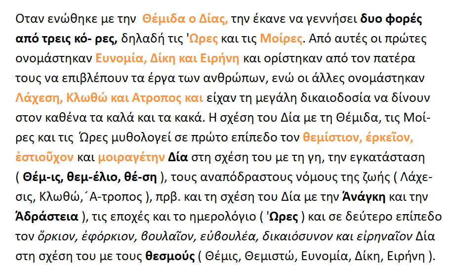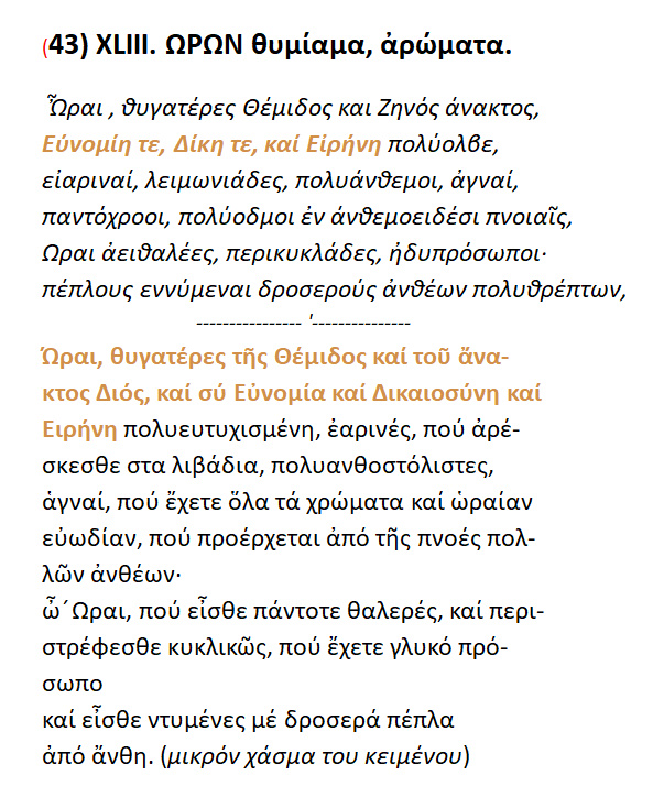 << Ώραι , θυγατέρες της Θέμιδος και του άνακτος Διός , και συ Ευνομία και Δικαιοσύνη και Ειρήνη …>>