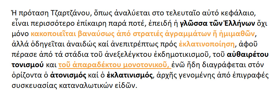 Δεν είναι τυχαίο το ρητό »ΜΕΤΡΟΝ ΑΡΙΣΤΟΝ »{ όχι παν μέτρον άριστον διότι είναι σοφιστεία. Ένα το μέτρο , ένα το μέσον }.Από την ‘καθαρεύουσα’ του Παττακού περάσαμε στην ‘δημοτική’ του Τσακαλώτου και μάλιστα χωρίς ενοχές .! < Από την Παττακιωτικήν στην Τσακαλωτικήν >.Αντιθέτως από τους καημένους Ποσειδωνιάτες του Κ.Καβάφη , οι οποίοι τουλάχιστον είχαν την συναίσθηση της συμφοράς τους ! Το στοίχημα είναι εάν θα μπορέσουν οι δάσκαλοι , οι καθηγητές , οι πανεπιστημιακοί να αντιτάξουν στις δύο κακίες που οδηγούν στα άκρα και την παρακμή , τον Λόγο , το μέτρον , το έτυμον της Ελληνικής γλώσσας . Ειδάλλως θα καταγραφούμε – μετά την πάροδο όχι πολλών ετών- ως Νέο-Ποσειδωνιάται ..Ευελπιστώ το πρώτο και απεύχομαι το δεύτερο.