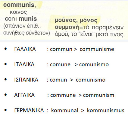 Communis { con + munis = συν + μούνος ,η,ον } = συμμονή, το παραμένειν ομού .