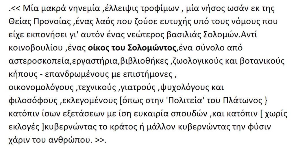 Ο Σερ Φράνσις Μπέικον {1561 -1626 μ.Χ.} ήταν Άγγλος φιλόσοφος, πολιτικός, επιστήμονας και συγγραφέας .Μεταξύ των δοκιμίων του Βάκωνος κατατάσσεται και η μυθική ιστορία για το νησί της Ατλαντίδας, την οποίαν συνέγραψε κατά τας δυσμάς του βίου του γι’ αυτό δεν την αποτελείωσε κι έτσι παράμεινε ημιτελής. Στην μυθική αυτή πολιτεία της» Νέας Ατλαντίδος »ήταν ανεπτυγμένη σε ύψιστο βαθμό η καλλιέργεια της επιστήμης και της τεχνικής. Ήδη σ’αυτή την μαγευτική ,του Νοτίου Ειρηνικού ,οι σολομωνικοί μάγοι είχαν εφεύρει μικροσκόπια ,τηλεσκόπια ,αυτοκουρδιζόμενα ρολόγια ,υποβρύχια,αυτοκίνητα και αεροπλάνα. Είχαν εφεύρει αναισθητικά ,ύπνωση και τρόπους συντηρήσεως της ζωής καθώς και τρόπους επιμηκύνσεως του βίου.Ακόμη βρήκαν τρόπου να εμβολιάζουν τα φυτά ώστε να παράγουν νέα είδη, να μετατρέπουν μέταλλα και να μεταβιβάζουν μουσική σε μεγάλες αποστάσεις .Στον οίκο του Σολομώντος η κυβέρνηση και η επιστήμη είναι μαζί συνδεδεμένες και όλα τα όργανα και η οργάνωση της έρευνας είναι μέρος του κρατικού εξοπλισμού.Η νήσος είναι οικονομικώς ανεξάρτητη και αποφεύγει το εμπόριον με τους ξένους ως παγίδα για πόλεμο.Εισάγει την γνώση όχι όμως και τ’αγαθά.
