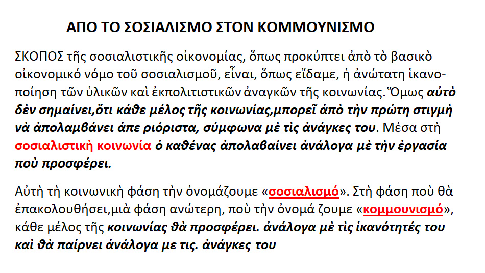 α].Σοσιαλισμός : o καθένας απολαμβάνει ανάλογα με την εργασία που προσφέρει . β].Κομμουνισμός : ο καθένας θα προσφέρει ανάλογα με τις ικανότητές του και θα παίρνει ανάλογα με τις ανάγκες του.