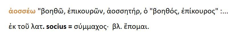 Αοσσέω { = βοηθώ , επικουρώ } > αοσσητήρ = socius { = σύμμαχος }.