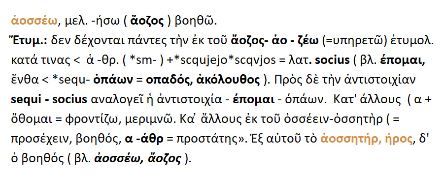 Αοσσητήρ = βοηθός ,σύμμαχος ,σωτήρ , υπερασπιστής [1.] Αοσσέω < Α αθρ.. + οσσέειν { < αοσσητήρ } [2.] Αοσσέω = αοζέω { =υπηρετώ } [3.] Αοσσέω < Α αθρ.+ οθομαι {= φροντίζω ,μεριμνώ }.