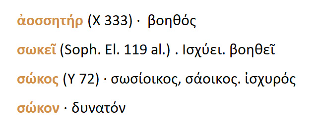 Αοσσητήρ =βοηθός . Σωκώ = βοηθώ , είμαι ισχυρός .Σώκον = δυνατόν.