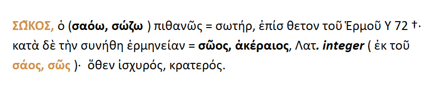 Σώκος { < σαόω =σώζω } : 1.{ ίσως } Σωτήρ ,επίθετο του θεού Ερμού 2.Σώος ,ακέραιος 3.Ισχυρός,κρατερός.