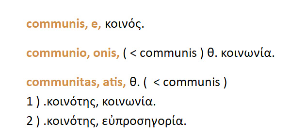 Koινός : communis-e . Κοινότης ,κοινωνία = communitas .