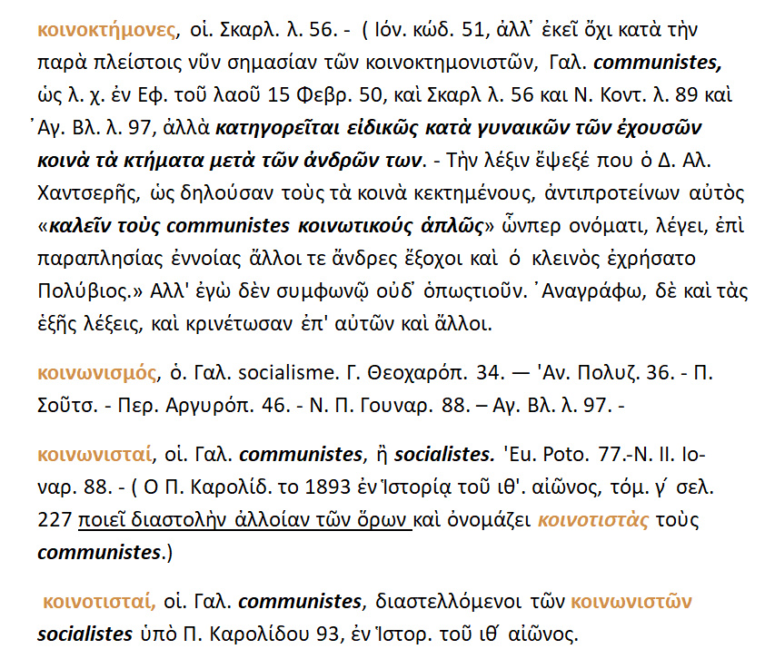 Η λ. ‘κοινοκτήμονες’ αναφέρεται στον Ιόν.κωδ.{ 1851 } αλλά με την σημασία της » κοινής κτήσης κτημάτων μετά των ανδρών των ».Η ίδια λέξη με άλλη έννοια όμως χρησιμοποιήθηκε ως μετάφραση της λ.communistes {= κοινοκτημονιστές.}.Ο Δ.Χαντζερής έψεξε την λέξη {διότι ενώ δηλώνει άλλο νόημα , εντούτοις έχει άλλη χρήση }και πρότεινε αντί για ‘κοινοκτήμονες’ οι ‘communistes’ να αποκαλούνται ‘κοινωτικοί’. Κοινωνισμός ,1834 { < γαλ. socialisme } .Κοινωτιστές ,1877 { < γαλ .communistes ή socialistes }.Ο Π.Καρολίδης {1892}διαχωρίζει τους σοσιαλιστές ως »Κοινωνιστές» από τους communistes ως »Κοινοτιστές » .