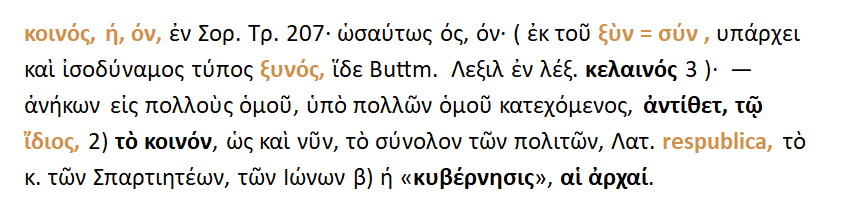 Κοινός ή ξυνός { ξυν = συν } = ο ανήκων σε πολλούς ομού { μαζί }, ο κατεχόμενος από πολλούς ομού . Κοινός =/= ίδιος { < ιδιώτης και ιδιωτεία }.