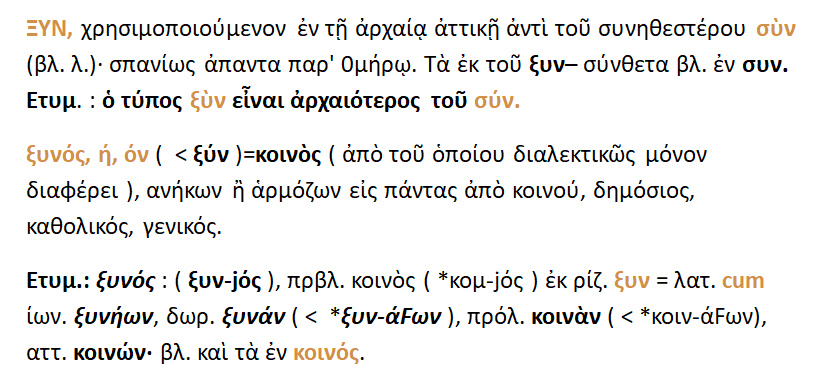 Ο τύπος ‘ ξυν ‘ είναι παλαιότερος του ‘συν’ . Ξυνός { < ξυν }= κοινός. Η ‘ξυν’ στα λατ. είναι η ‘cum’.
