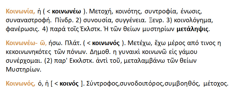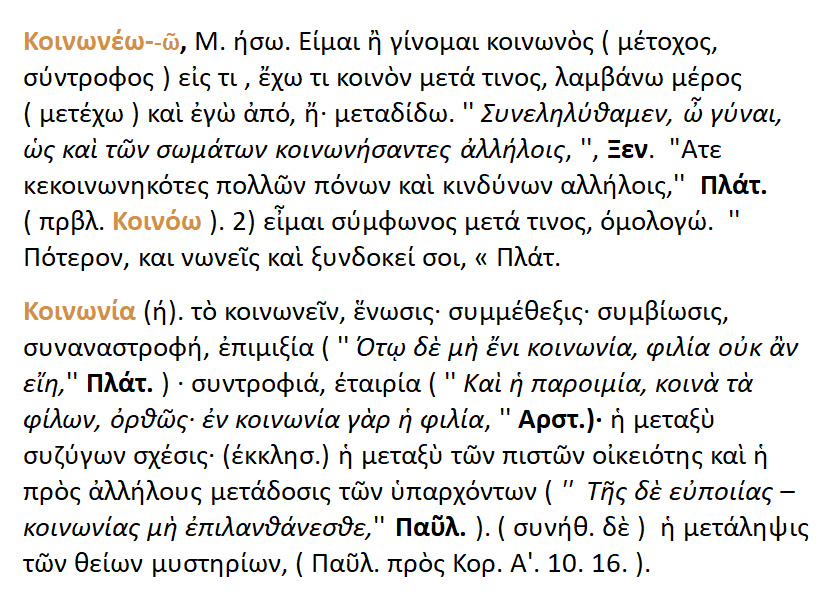 Κοινωνέω-ώ : 1. είμαι ή γίνομαι κοινωνός [ μέτοχος σύντροφος ]σε κάτι , έχω κάτι κοινό με κάποιον ,λαμβάνω μέρος [μετέχω] και εγώ από..2. είμαι σύμφωνος με κάτι,ομολογώ . Κοινωνία : το κοινωνείν ,ένωση ,συμμέθεξη ,συμβίωση,συναναστροφή ,συντροφιά, εταιρία, η μεταξύ των συζύγων σχέση , η μεταξύ των πιστών οικειότητα ,η μετάληψη των Θείων Μυστηρίων .