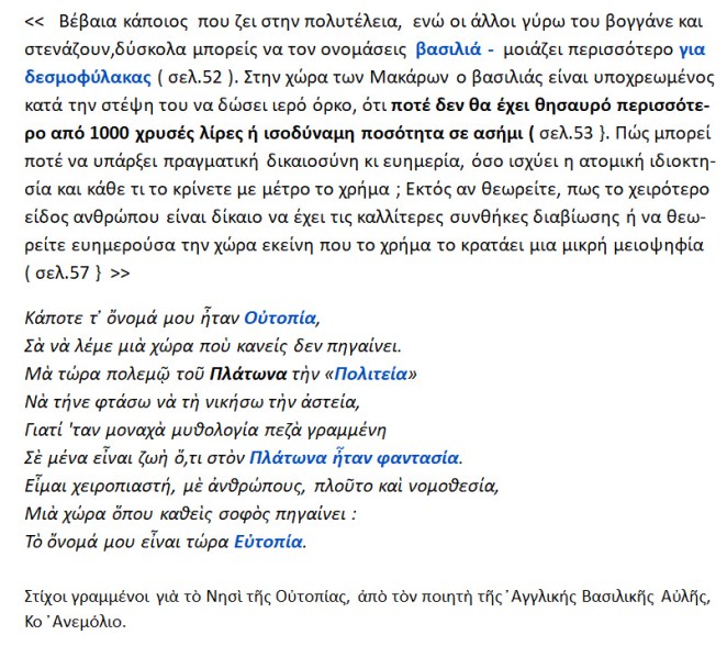 Σε πολλές ταραγμένες ιστορικά εποχές ή σε μεταβατικές { όπου το παλαιό δεν έχει παλιώσει αρκετά ,αλλά ούτε και το νέο έχει κατορθώσει να παραμείνει νέο } ή σε σκοταδιστικές ,{ όπου ο πνευματικός Μεσαίωνας μοιάζει ακλόνητος και ανίκητος, αψηφώντας αλαζονικά τα διδάγματα της ιστορίας } εμφανίζεται η διάθεση φυγής από την αλλοτρίωση που προξενεί σκληρή πραγματικότητα.Τότε αναδύεται από την φαντασία των οραματιστών συγγραφέων ένα μαγευτικό νησί στον ωκεανό της αλλοτρίωσης, ιδανικό και με τέλειους ανθρώπους ,χωρίς ανθρώπινα ελαττώματα παρά μόνο προτερήματα. Όμως ο μέγας ποιητής και φιλόσοφος Πλάτων -μετά τα γεμάτα απογοήτευση ταξίδια του στις Συρακούσες- αποδοκίμασε την ιδανική ‘Πολιτεία’ του και στα γεράματα συνέγραψε τους ‘Νόμους’ ,διότι η τέλεια πολιτεία θα χρειαζόταν και τέλειους πολίτες να την υπηρετούν .Όλοι οι πολίτες όμως είναι άνθρωποι και ως γνωστόν οι άνθρωποι ,εκ φύσεως ,δεν είναι τέλειοι και αυτάρκεις ,αλλά ατελείς και με ανθρώπινες αδυναμίες .Άρα οι άνθρωποι ,λόγω της φυσικής τους ατελείας , είναι αδύνατον να ιδρύσουν ή να ζήσουν σε μια τέτοια ιδανική πολιτεία.Παρ’ όλα αυτά η ελπίδα μαζί με το όραμα και την πίστη που προσφέρουν οι ουτοπικές πολιτείες είναι κάποιου είδους σεβαστά επιχειρήματα και σίγουρα υπολογίσιμα κίνητρα για τον δρόμο προς την καλλιτέρευση της ανθρώπινης κοινωνίας.