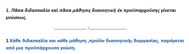 << Κάθε διανοητική { δια του νου ,νοερώς } διδασκαλία { δι-δά-σκα-λος =αυτός που δίδει δάδα[=μεταλαμπαδεύει το πνευματικό φως ] στον οίκο } και κάθε διανοητική μάθηση { μαθ-ητής = αυτός που παίρνει την δάδα [= το πνευματικό φως ] και μανθάνει }, γίνεται από γνώση που προϋπάρχει. >> Άλλωστε το πνευματικό φως της γνώσεως απλώς μεταλαμπαδεύεται από δάσκαλο σε μαθητή .Κανείς άνθρωπος δεν είναι κάτοχος και ιδιοκτήτης της απολύτου και εξ αποκαλύψεως γνώσεως.Όποιος δε το ισχυρίζεται αυτό μάλλον ομοιάζει με οδοποιό στους κακοτράχαλους δρόμους της επιστημονικής έρευνας ή το κάλλιον , με σκυταλοδρόμο στον δρόμο αντοχής της επιστημονικής αληθείας.