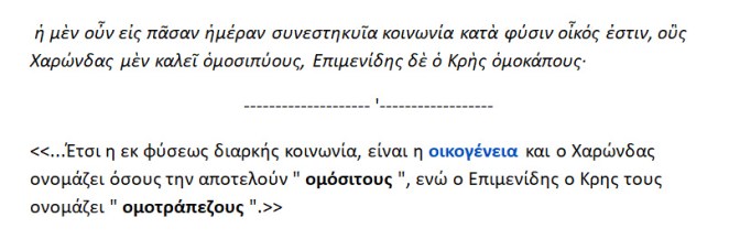 Η οικογένεια είναι η κοινωνία που που εκ φύσεως έχει συγκροτηθεί ώστε να παραμένει όλο τον καιρό { Η οικογένεια έχει άμεση σχέση με την κοινή τράπεζα και με αυτούς που συντρέφονται δηλ. συντρόφους }.Αυτούς που την αποτελούν ,ο Χαρώνδας αποκαλεί ‘ομόσιτους ‘ , ενώ ο Επιμενίδης ο Κρης ονομάζει ‘ομοτράπεζους’.