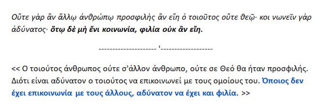 <<…διότι -τέτοιου είδους άνθρωπος – δεν θα μπορεί να έχει επικοινωνία . Και όποιος στερείται την επικοινωνία με τους άλλους , αδύνατον να έχει και φιλία. >>