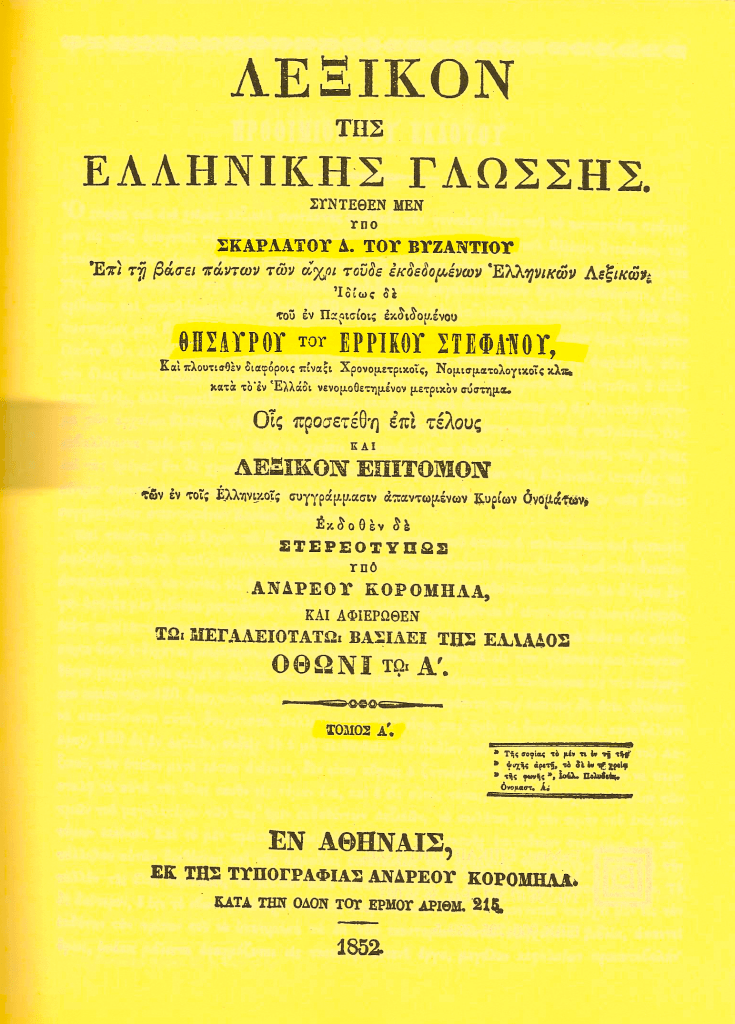 ΣΚΑΡΛΑΤΟΥ Δ. του ΒΥΖΑΝΤΙΟΥ – » Λεξικόν της Ελληνικής γλώσσης ».