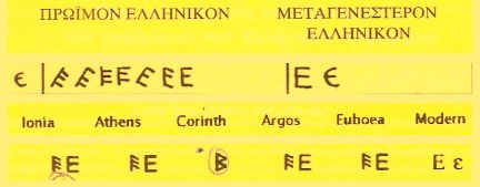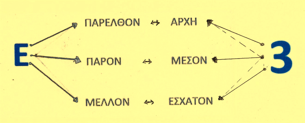 Το γράμμα [ Ε ] δηλώνει την διαχρονικότητα ,διότι συνδέει το παρελθόν ,το παρόν και το μέλλον .Κάθε οριζόντια γραμμή του γράμματος -Ε- παριστάνει έναν από τους τρεις χρόνους [ παρελθόν-παρόν-μέλλον ].Όλες δε οι οριζόντιες γραμμές συνδέονται δια μιας καθέτου γραμμής και απαρτίζουν μίαν έννοιαν.