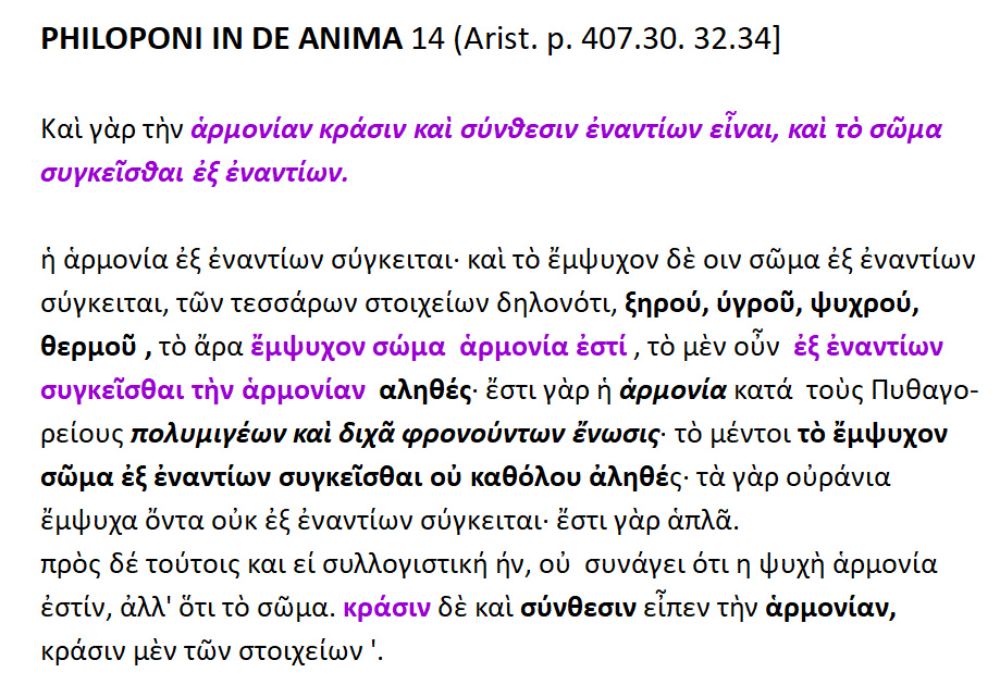 H αρμονία από αντίθετα [στοιχεία ] συντίθεται. Και το έμψυχο σώμα από αντίθετα συντίθεται , σαφώς από τέσσερα στοιχεία : ξηρό ,υγρό ,ψυχρό ,θερμό.Άρα το έμψυχο σώμα είναι αρμονία. Το μεν ,ότι η αρμονία από αντίθετα συντίθεται ,είναι αληθές. Διότι αρμονία κατά τους Πυθαγορείους είναι η ένωσις των διαφορετικών στοιχείων [πολυμιγής = πολυανακατεμένος } και η συμφωνία των διαφωνούντων. Όμως ότι το σώμα συντίθεται από αντίθετα δεν είναι απολύτως αληθές. Διότι τα ουράνια έμψυχα όντα δεν συντίθενται από αντίθετα. Επειδή είναι απλά. ….Επιπλέον { εξ αυτού του συλλογισμού} ,αν ήταν [ αληθινός ] συλλογισμός , δεν συνάγεται το συμπέρασμα ότι η ψυχή είναι αρμονία ,αλλά το σώμα. Διότι η αρμονία είναι κράσις και σύνθεσις .Κράσις μεν των στοιχείων ‘