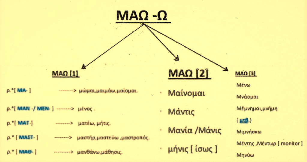 Μάω : a].επιθυμώ τι ,το επιδιώκω μετά θέρμης ,το ποθώ b].επιθυμώ να είμαι , αξιώ ότι είμαι. Διαιρείται σε : MAΩ [1] = σφοδρά επιθυμία ,πόθος ,σύντονος σκοπός // ΜΑΩ [2] = Έξαψις του νου ,διατάραξις // ΜΑΩ[3] =Σκέψις ,διάσκεψις ,εμμονή .