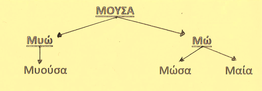 Moύσα : 1.Kάποιοι ισχυρίζονται ότι Μούσα =η μυούσα .Διότι σε τίποτα δεν διαφέρει η μουσική από τα μυστήρια{ δλδ. μυώ > μουσική ,μυστήριο}.2. Όπως δε άλλοι λένε ,ότι Μούσα =η μώσα .Διότι μω και μώμαι = ζητώ. Και την μητέρα του Ερμού { =λόγου } Μαίαν την λένε ,από την [ανα]ζήτησιν και την εύρεσιν των μαθημάτων. Από αυτό [ το ρήμα μω ] και η μαία και η μούσα.