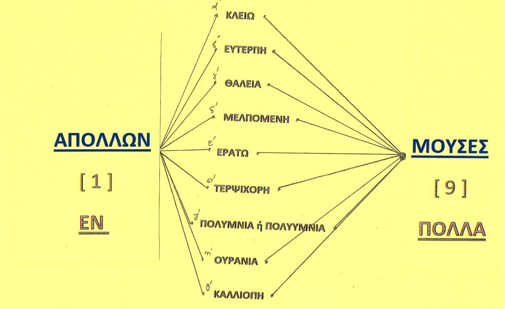 » …διότι ο Απόλλων εξυμνείται ως Μουσηγέτης ,και είναι ο ίδιος ΜΟΝΑΔΑ σε σχέση με την εντός του σύμπαντος ΑΡΜΟΝΙΑ .Ο χορός των Μουσών εξάλλου είναι δεκτικός του σύνολου αριθμού της ΕΝΝΕΑΔΟΣ » από τα δύο αυτά στοιχεία άλλωστε ο κόσμος όλος << δέθηκε με τ’ άλυτα δεσμά >>…..»