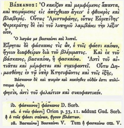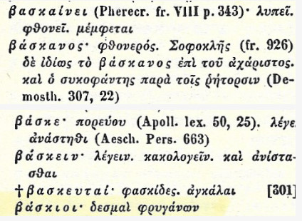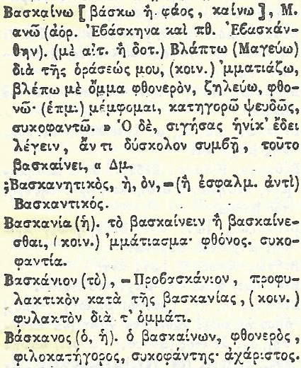 Βασκαίνει = λυπεί , φθονεί ,μέμφεται [Φερεκράτης ] .Βάσκανος = ο φθονερός [ Σοφοκλής] ιδίως ο αχάριστος ,ο συκοφάντης [ Δημοσθένης]. Βάσκειν =το λέγειν ,κακολογείν. Βάσκιοι= δεσμοί φρυγάνων . { λύπη –> φθόνος –> μομφή }