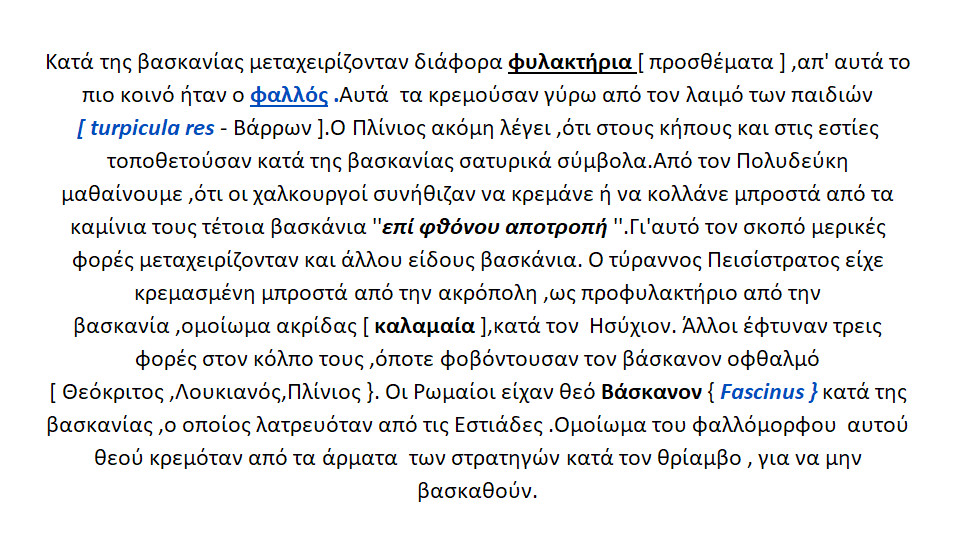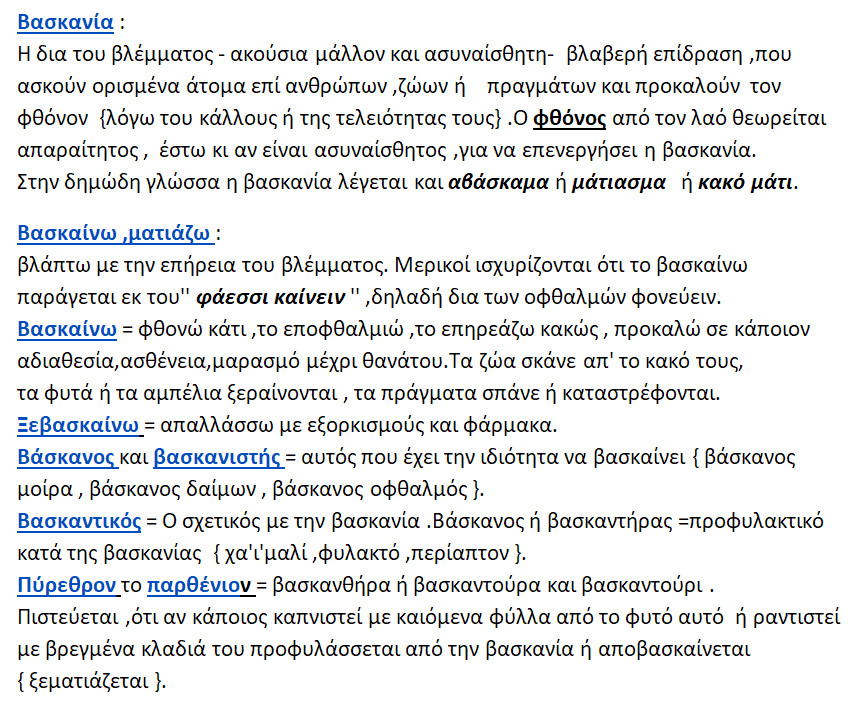 Bασκανία = Fascinato . Bασκάνιον = Fascinum .Bάσκανος = Fascinator ,Fascinatrix = βάσκανος οφθαλμός .