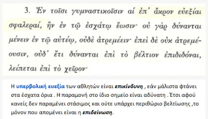 » Σφαλεραί αι ευεξίαι επ’ άκρον » = η ευεξία [των αθλητών ] είναι εσφαλμένη ,όταν φτάνει στα άκρα.