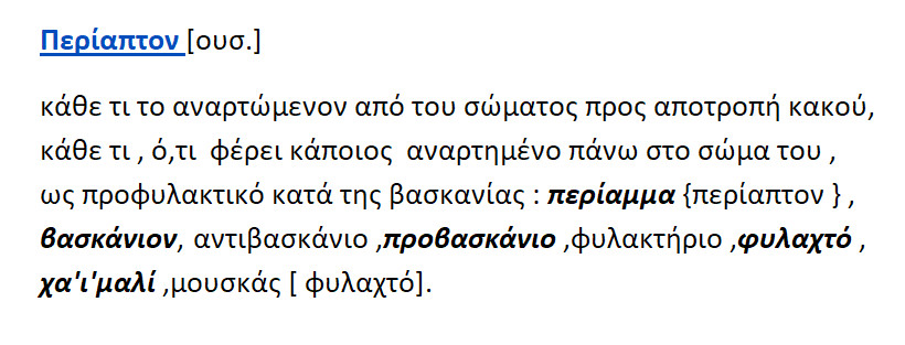 Περίαπτον [ουσ.] , περίαμμα [περίαπτον ],βασκάνιο ,αντιβασκάνιο ,προβασκάνιο ,φυλακτήριο ,φυλαχτό ,χα’ι’μαλί .