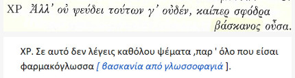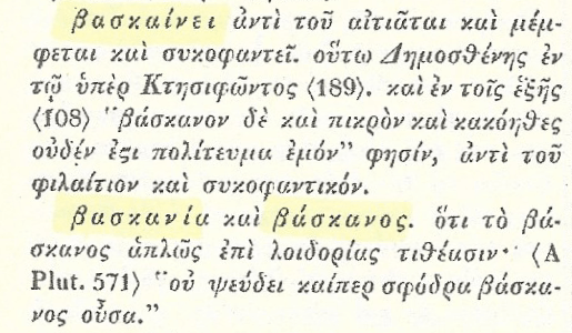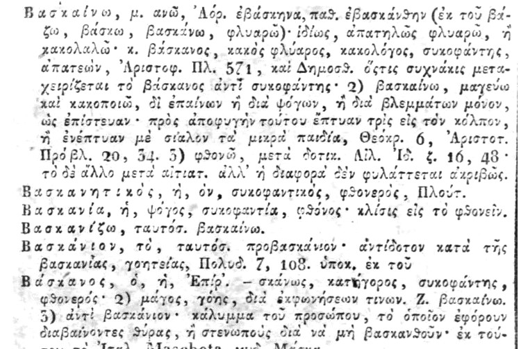 Βάσκανος ,το χρησιμοποιούσαν επί λοιδορίας [ ύβρεως ,κακολογίας ] .Αριστοφάνους { Πλούτος ,571 } : << Δεν ψεύδεσαι, αν και είσαι υπερβολικά κακολόγος [θηλ.] >> .