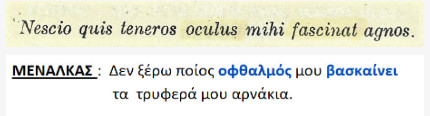 Ο βουκόλος Μενάλκας παραπονιέται για τους ισχνούς αμνούς του δείχνοντας ,σαν αιτία γι’ αυτό ,την βασκανία. Oculus fascinus = οφθαλμός βάσκανος .