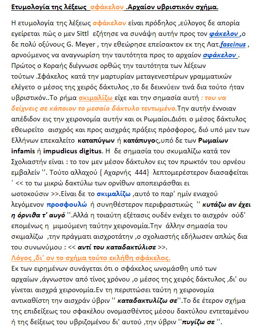 Πρώτος ο Κοραής διέγνωσε ορθώς την ταυτότητα των λέξεων τούτων .Σφάκελος κατά την μαρτυρίαν μεταγενεστέρων γραμματικών ελέγετο ο μέσος της χειρός δάκτυλος ,το δε δεικνύειν τινά δια τούτο ήταν υβριστικόν..Το ρήμα σκιμαλίζω είχε και την σημασία αυτή : του να δείχνεις σε κάποιον το μεσαίο δάκτυλο τεντωμένο. Σφάκελος ονομάσθηκε από τους αρχαίους ,ο μέσος δάκτυλος του χεριού ,με το οποίο γίνεται αισχρή χειρονομία. Στη περίπτωση αυτή η χειρονομία αντικαθιστά την αισχράν ύβρη » καταδακτυλίζω σε».