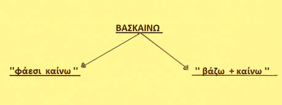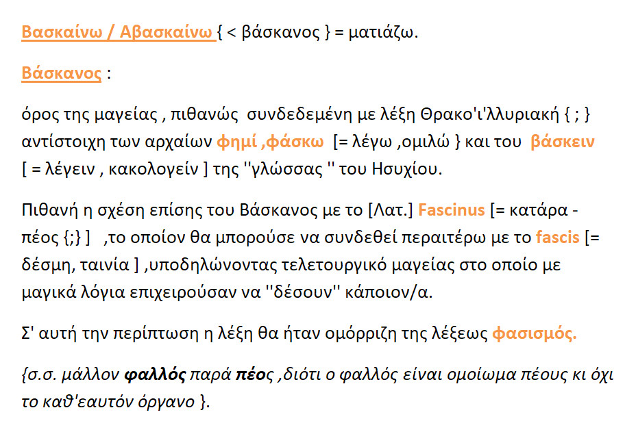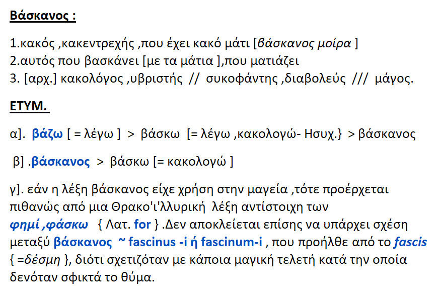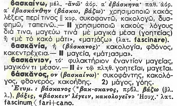Βασκαίνω { < βάσκω , βάζω } = 1. κακολογώ ,συκοφαντώ ,δυσφημώ 2. μαγεύω ,γοητεύω ,ματιάζω { Λατ.fascinare }. Βάσκανος { < * ΒΑΚ– σκανός < βάξις [ < βάζω = λέγω ] } = κακολογώ. Λατ. fascinum { < fari [< for = φάσκω ] + cano } = άδω .