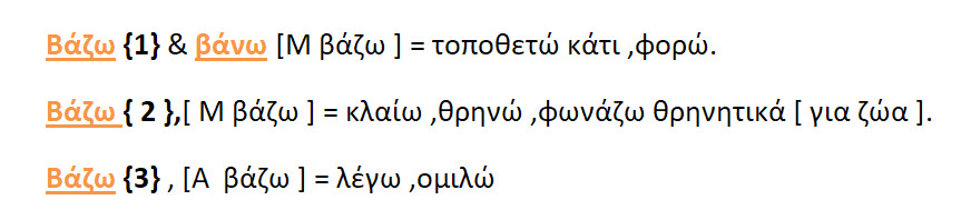 Βάζω [1] , Βάζω { 2 }, Βάζω {3} .
