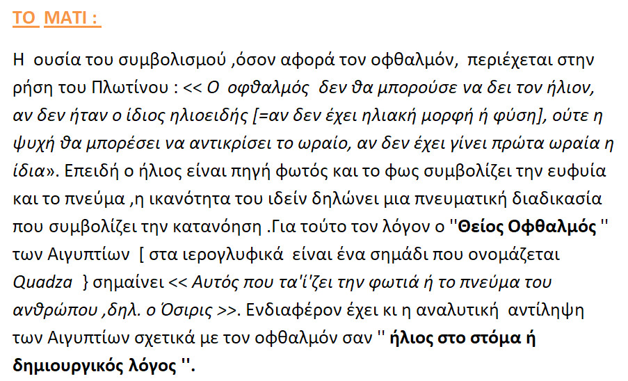 O »Θείος Οφθαλμός » των Αιγυπτίων [ στα ιερογλυφικά Quadza } σημαίνει << Αυτός που τα’ί’ζει την φωτιά ή το πνεύμα του ανθρώπου ,δηλ. ο Όσιρις >>.