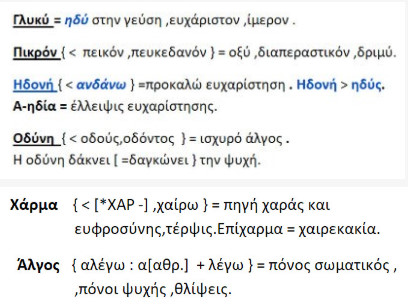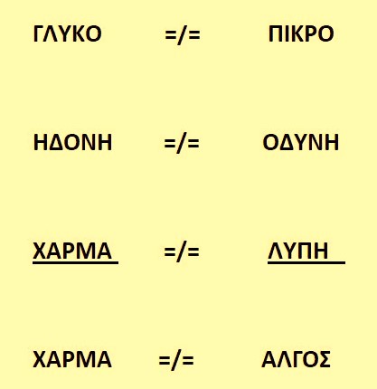 Γλυκύ = / = Πικρό , Ηδονή =/= Οδύνη , Χάρμα = / = Λύπη ή Άλγος.