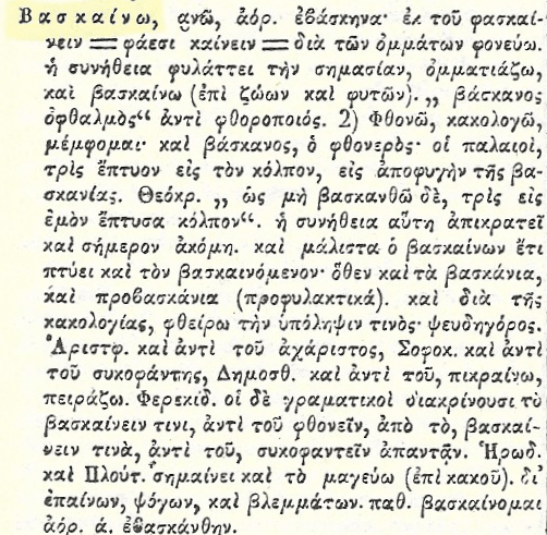 Βάσκανος = »ο τους φαέσι καίνων» ,δηλαδή ο φονεύων. Βάκχος , με πλεονασμό του [ κ ], βάζω ,βάξω ,βάχος και βάκχος ,όπως από την ιαχή —> ίαχος. { 53 }.Βάσκανος ως εάν φάσκανος [ τροπή του φ —> β ] . Φάσκανος είναι κάποιος ο οποίος καίνει {= φονεύει } δια των οφθαλμών { τα φάεα = οι οφθαλμοί }. Φθόνος : 1. από το φθονείν 2. από το ότι είναι αίτιο φόνων [75] ή το φρενών παραίτιον είναι [Ε.Μ]. Ο φθόνος είναι φθαρτικόν { φθίω ,φθίνω > φθόνος } φθείρει και τον νού [ φθορόνους ] .Ο φθόνος φθίνει αυτόν που τον κατέχει.