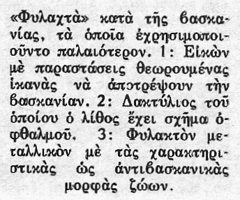 Γι’ αυτό και τα λεγόμενα φυλακτά δεν ενεργούν αυτοβούλως ,λόγω κάποιας ιδιαίτερης αποτρεπτικής δύναμης που έχουν ,αλλά ενεργούν δια της εντυπώσεως που προκαλούν σε αυτόν που τα κοιτάζει ,συγκεντρώνοντας [ το φυλακτό ] τα φθονερά βλέμματα του βάσκανου οφθαλμού..