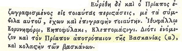Βρέθηκε δε και ο Πρίαπος ζωγραφισμένος σε τέτοιες καταστάσεις , με τα σύμβολά του ,και έχοντας μια τέτοια επιγραφή : στον Ιθύφαλλο [ ο έχων το πέος σε στύση ] , στον Κορυνοφόρο [ο ροπαλοφόρος ], στον Κηποφύλακα, στον Κλεπτομάστιγα [ο μαστιγώνων τους κλέφτες ] .Διότι πίστευαν ,ότι και ο Πρίαπος είναι αποτροπιαστικό κατά της βασκανίας και τιμωρός των βασκάνων.