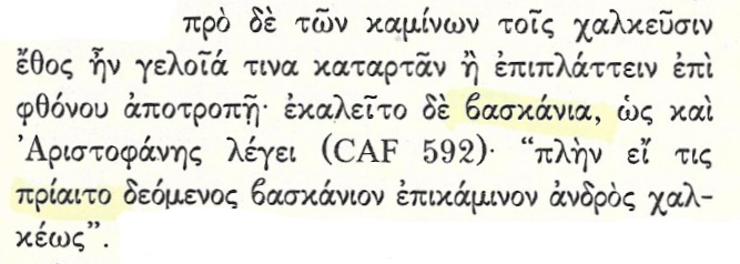 Μπροστά από τα καμίνια των χαλκουργείων ήταν συνήθεια να κρεμάνε ή να κολλάνε κάποια γελοία αντικείμενα για την αποτροπή του φθόνου..Αυτά τα έλεγαν βασκάνια ,και όπως λέγει και ο Αριστοφάνης { fragm.} : << εκτός αν κάποιος αγοράσει το βασκάνιον, που έχει ανάγκη, από το καμίνι ενός χαλκουργού. >>.