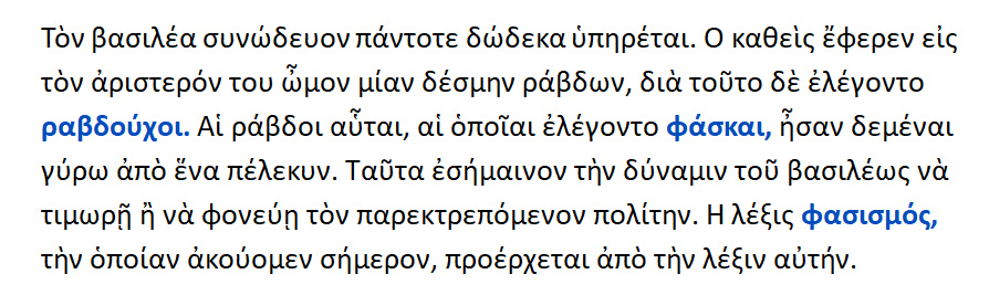 Οι ραβδούχοι έφεραν στον αριστερό ώμο μία δέσμη ράβδων ,οι οποίες λέγονταν φάσκες και ήσαν δεμένες γύρω από ένα τσεκούρι. Η λέξη φασισμός {< fascismo < fascio < fascina και fascis } προέρχεται από την λέξη αυτή ,διότι το σύμβολο αυτό είχε υιοθετήσει ο Μπ.Μουσολίνι για το Partito Nazionale Fascista { Εθνικό Φασιστικό Κόμμα }.