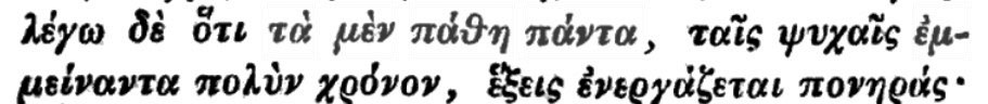 α].Όλα τα πάθη που παραμένουν πολύ καιρό στην ψυχή ,απεργάζονται έξεις κακές. Έτσι προκαλούν κακό ακόμη και στους οικείους τους, χωρίς βεβαίως να το επιδιώκουν συνειδητά. Έτσι τον φθονερό κάνει η διάθεση να αντιδρά με φθόνο σε κάθε περίπτωση. Ακόμη επειδή ρίχνουν το βλέμμα τους σε ό,τι είναι περισσότερον οικείον και ποθητό ,γι’ αυτό και του προξενούν μεγαλύτερη βλάβη.