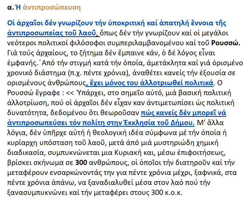 << Η δημοκρατία ως ιστορικό προ’ι’όν ταυτίζεται με την »αντιπροσωπευτική δημοκρατία » >> ! { σελ. 8}.