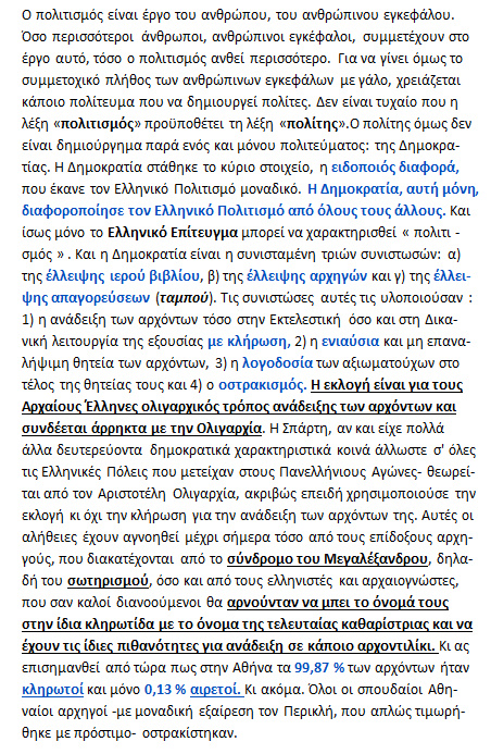Στην πραγματική Δημοκρατία των Αθηνών ,τον χρυσό αιώνα του Περικλή ,το 99,87 % των αρχόντων ήταν ΚΛΗΡΩΤΟΙ και μόνον το 0,13 % ΑΙΡΕΤΟΙ { δια ψήφου }. Σήμερα πόσοι άρχοντες είναι ΚΛΗΡΩΤΟΙ [ με κλήρωση } ,ώστε να χαρακτηριστεί αυτό το πολίτευμα ως ΔΗΜΟΚΡΑΤΙΚΟ ; Δώστε την απάντηση μόνες και μόνοι σας.