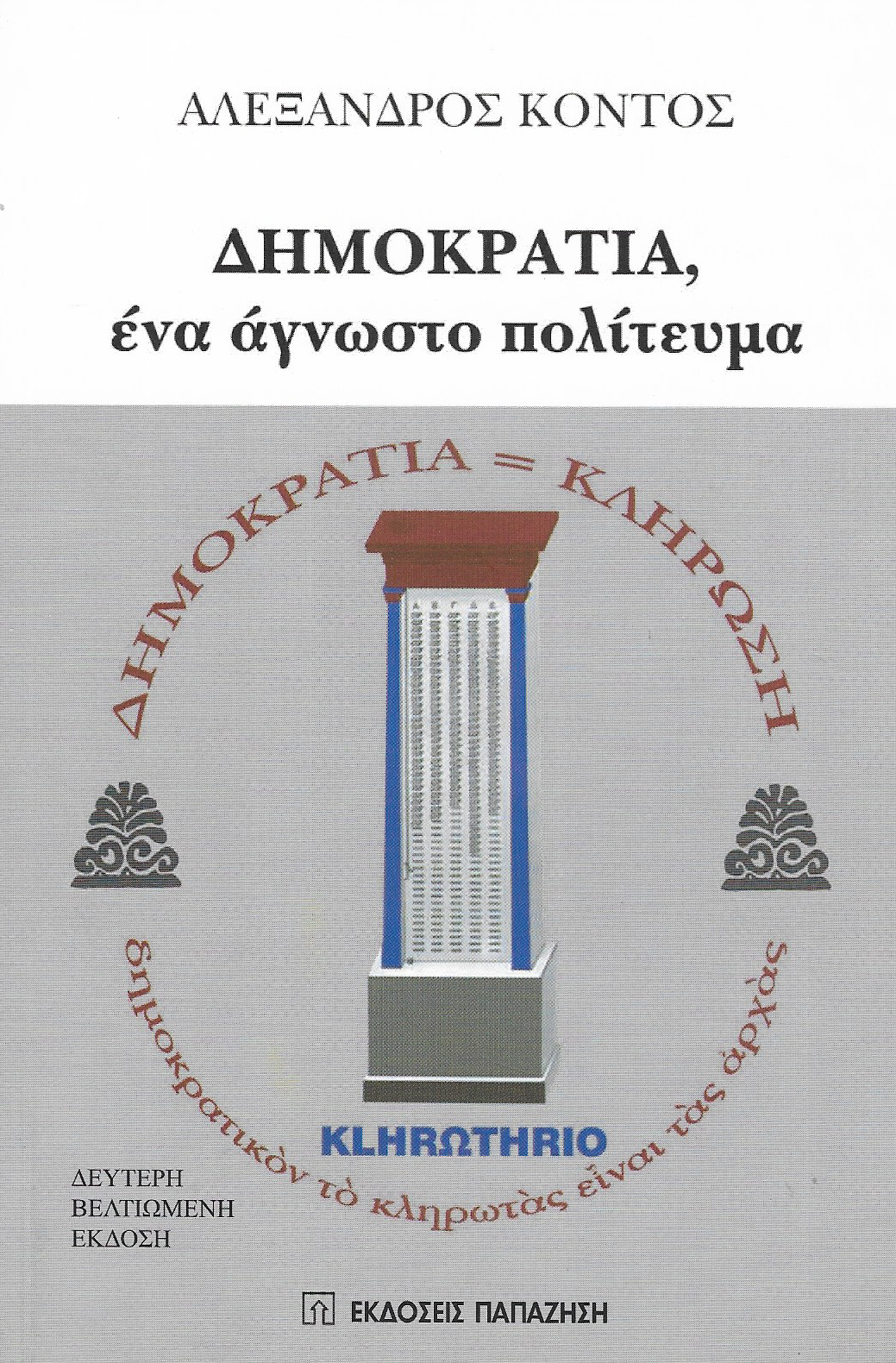ΑΛΕΞ. ΚΟΝΤΟΥ – » Δημοκρατία , ένα άγνωστο πολίτευμα », { οπισθόφυλλο }.