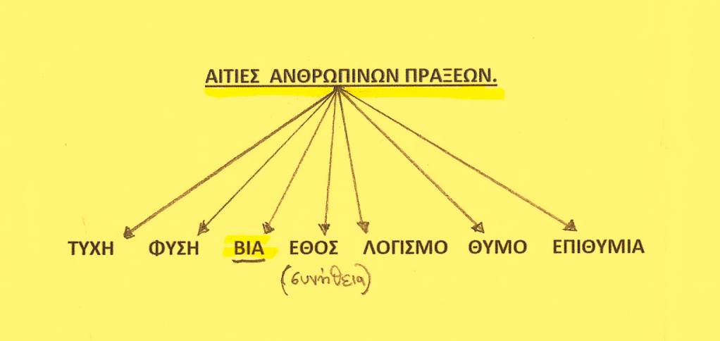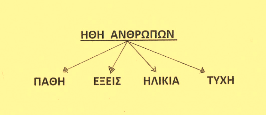 Τα ήθη { χαρακτήρες } των ανθρώπων εξετάζονται κατά τα πάθη τους , τις έξεις , τις ηλικίες και την τύχη . Πάθη = οργή – επιθυμία και τα παρόμοια .Έξεις =αρετές – κακίες Ηλικίες = νεότητα – ωριμότητα- γήρας . Τύχη = ευτυχία -δυστυχία { ευγένεια ,πλούτος ,δύναμη και τα αντίθετα }.