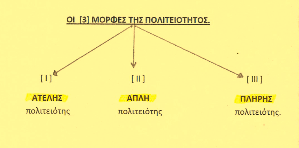 Η πολιτειότης { = η ιδιότητα του πολίτη } δεν είναι μία αλλά πολλές ,όσες και οι εκδηλώσεις της ελευθερίας ,που αποτελεί το συστατικό της υπόβαθρο. ..Η πλήρης πολιτειότης ορίζει τον πολίτη της δημοκρατίας που απολαμβάνει συσσωρευτικά την ατομική ,κοινωνική και πολιτική ελευθερία ή αυτονομία… Ο πολίτης της νεωτερικότητος είναι ατελής πολίτης ,υπήκοος του κράτους ,όχι όμως πολίτης της πολιτείας.
