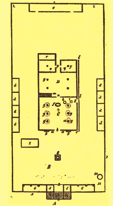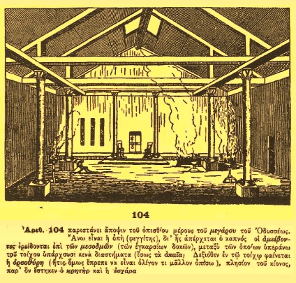 Σχ.104 : παριστάνει άποψιν του οπισθίου μέρους του μεγάρου του Οδυσσέως . Άνω είναι η οπή [ φεγγίτης ] ,δια της οποίας απέρχεται ο καπνός .Δεξιόθεν στον τοίχο φαίνεται η ορσοθήρη { θύρα μεγάλη υπέρ του εδάφους } πλησίον του κίονος , κοντά στον οποίον στεκόταν ο κρητήρ { = κρατήρ ,αγγείον προς κράσιν οίνου και ύδατος } και η εσχάρα.