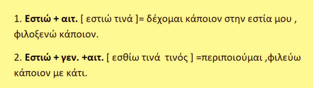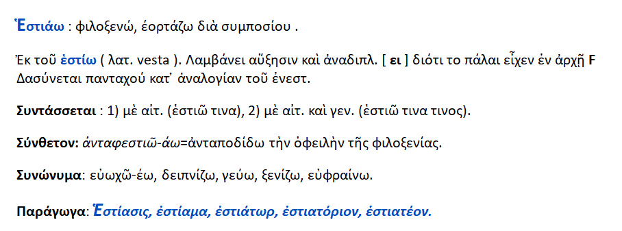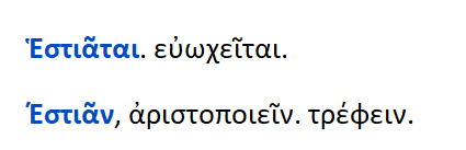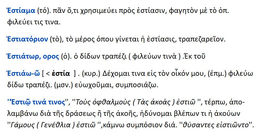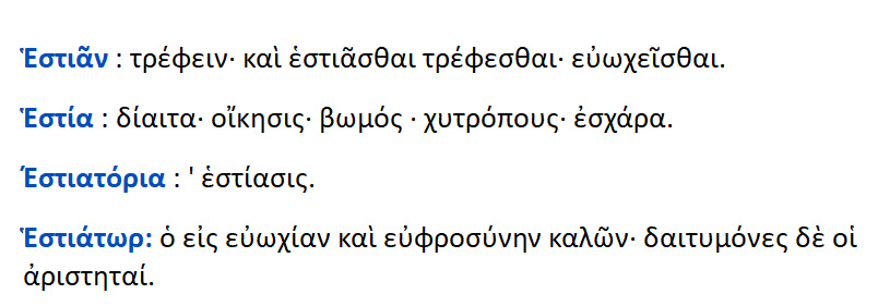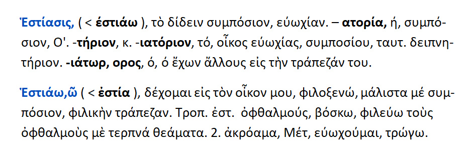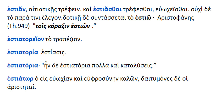 Εστιάν = το τρέφειν .Εστιάσθαι = το τρέφεσθαι , ευωχήσθαι Εστιατόριον = το τραπέζιον Εστιάτωρ = ο καλών σε ευωχία και ευφροσύνη .Δαιτυμόνες = οι αριστητές .